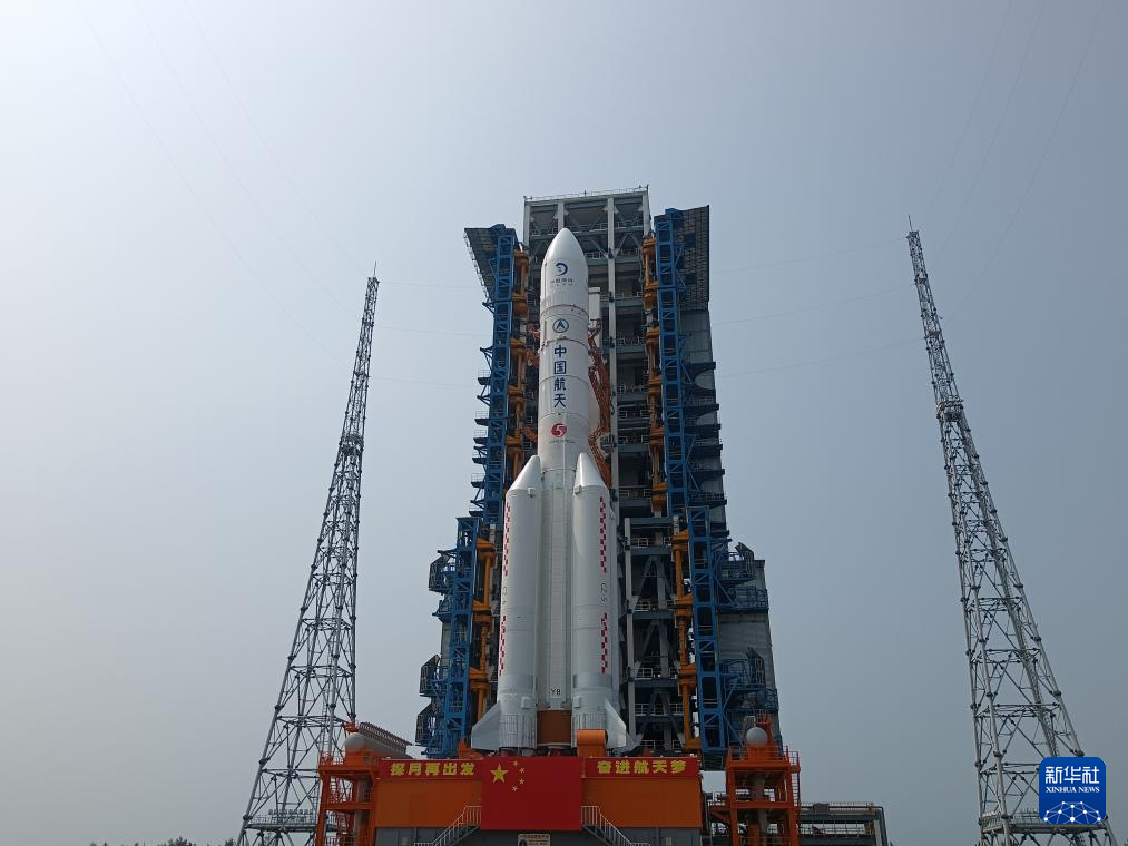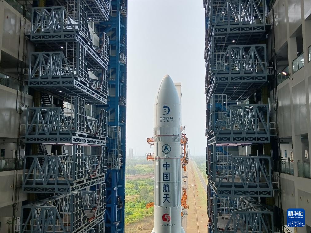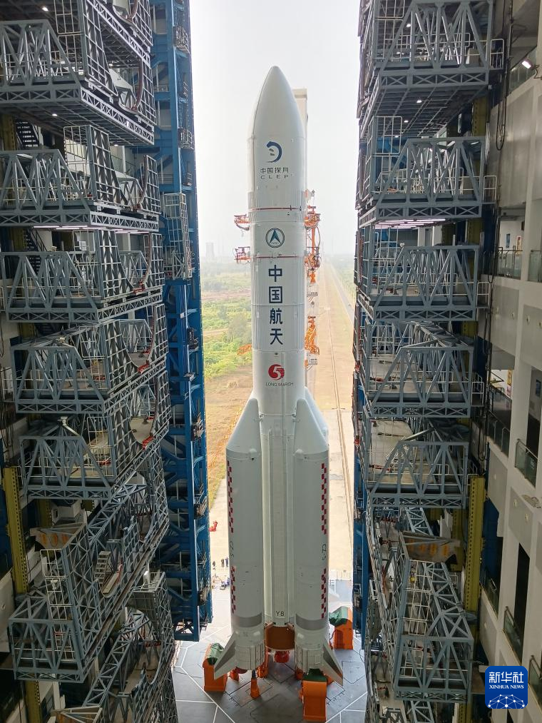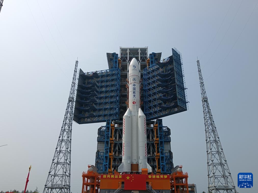 4月27日,嫦娥六号探测器和长征五号遥八运载火箭器箭组合体在垂直转运中。