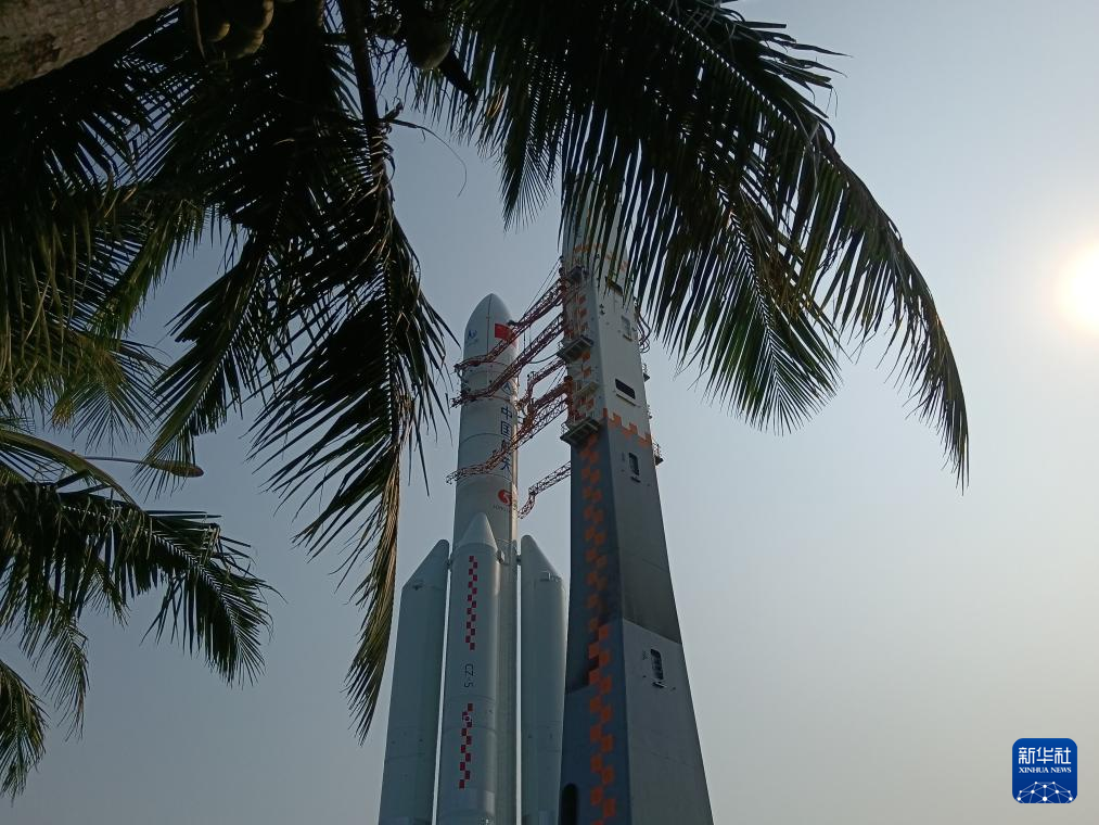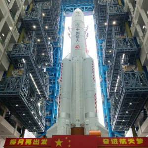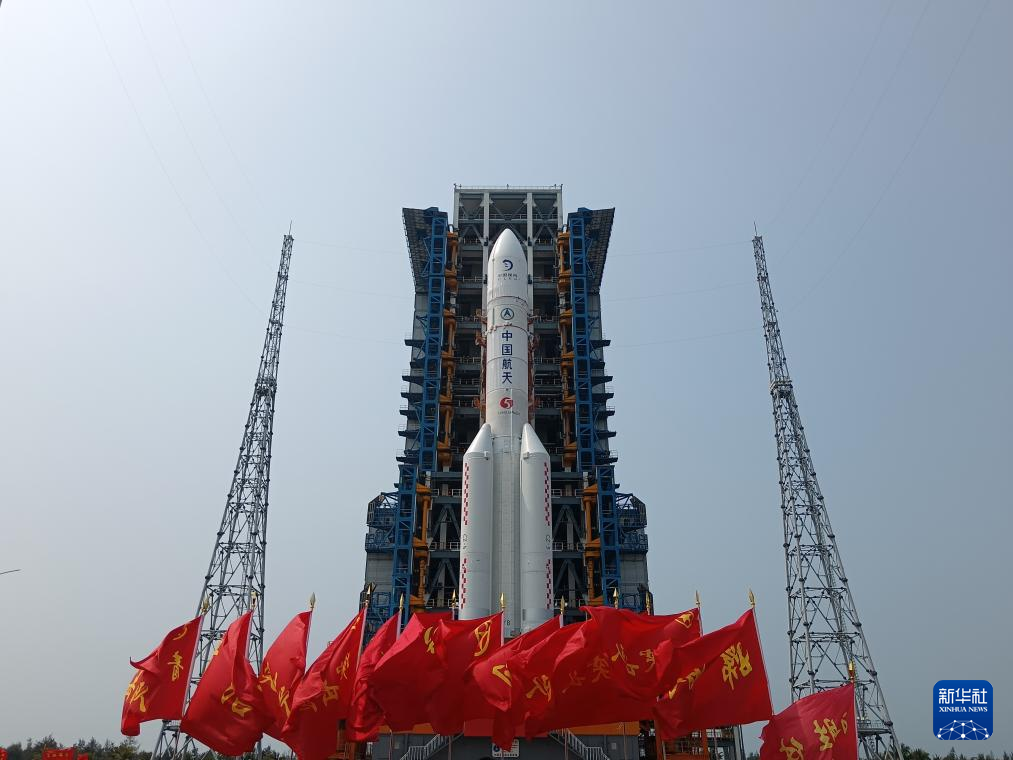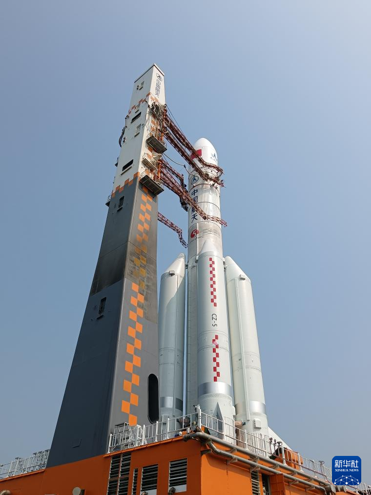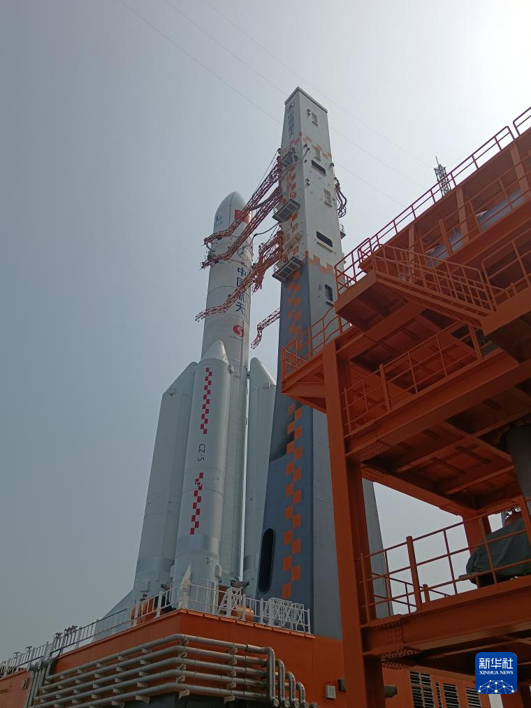 4月27日,嫦娥六号探测器和长征五号遥八运载火箭器箭组合体在垂直转运中。