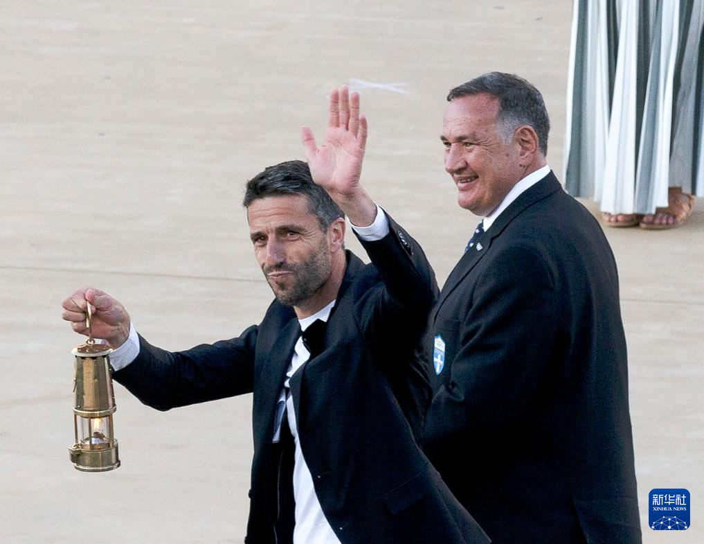 4月26日,巴黎奥组委主席托尼·埃斯坦盖(左)在仪式上展示巴黎奥运会火种灯。