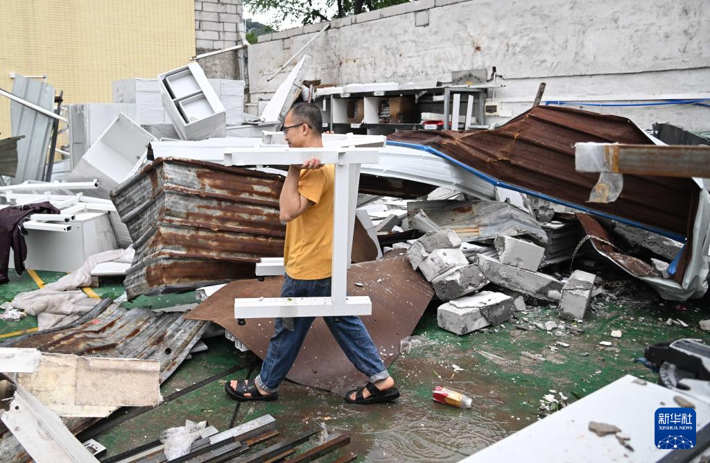 4月28日,在遭受龙卷风袭击的广州市白云区钟落潭镇光明村,工作人员在清理受灾现场。