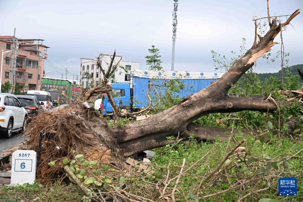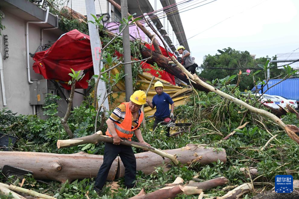 4月28日,在遭受龙卷风袭击的广州市白云区钟落潭镇陈洞村,工作人员在清理倒伏树木。