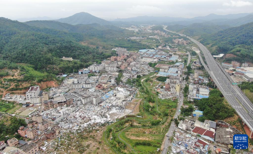 遭受龙卷风袭击的广州市白云区钟落潭镇光明村房屋受损情况(4月28日摄,无人机照片)。