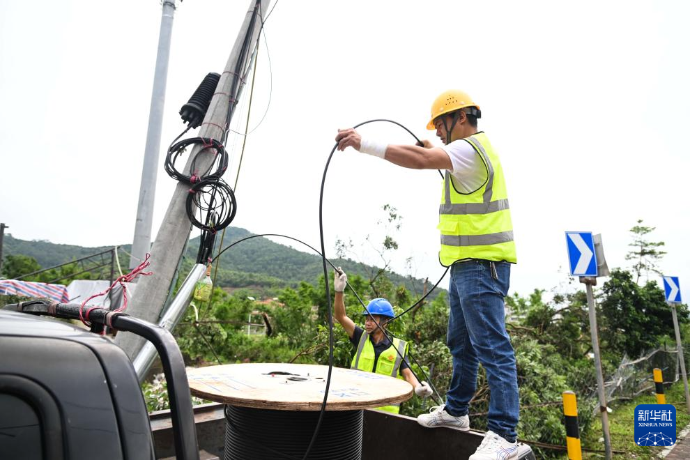 4月28日,在遭受龙卷风袭击的广州市白云区钟落潭镇光明村,工作人员在修理网络线路。