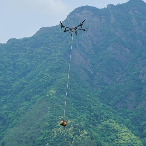 4月27日,在安徽省黄山市黄山区新明乡猴坑村,“90后”新农人项凡操作运载无人机在山区运送货物(无人机照片)。