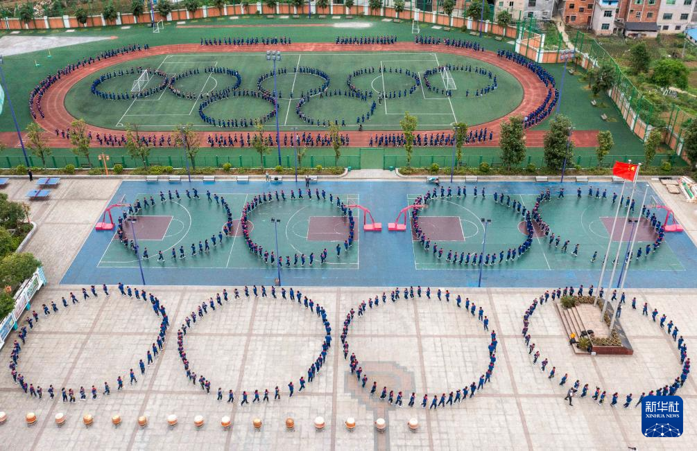 4月29日,学生在贵州省岑巩县羊桥土家族乡中心小学参加民族特色大课间活动(无人机照片)。