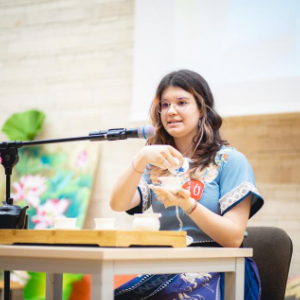 4月27日,在罗马尼亚锡比乌,一等奖获得者德艺燃(中文名)在第17届“汉语桥”世界中学生中文比赛罗马尼亚赛区决赛中表演茶艺。