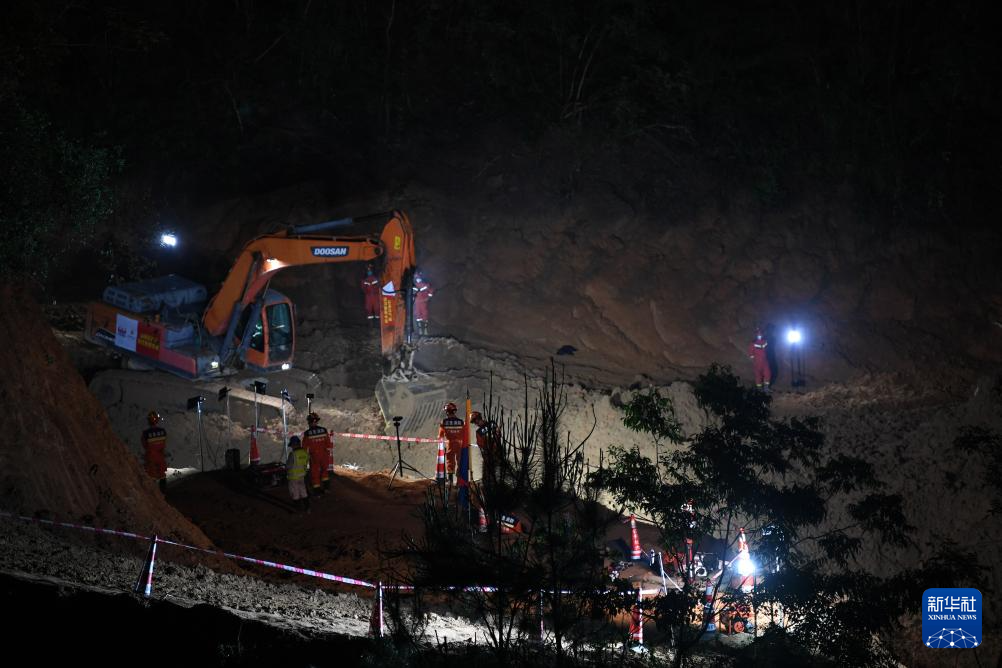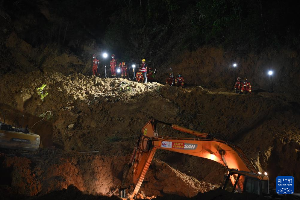 5月2日晚,救援力量在广东梅大高速茶阳路段塌方灾害现场作业。
