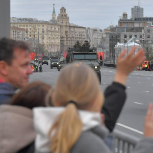 5月2日,在俄罗斯首都莫斯科,车辆编队从市中心驶过。