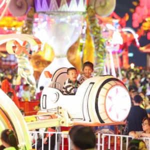 小朋友在新疆乌鲁木齐市水磨沟区天山明月城体验游乐设施(5月4日摄)。