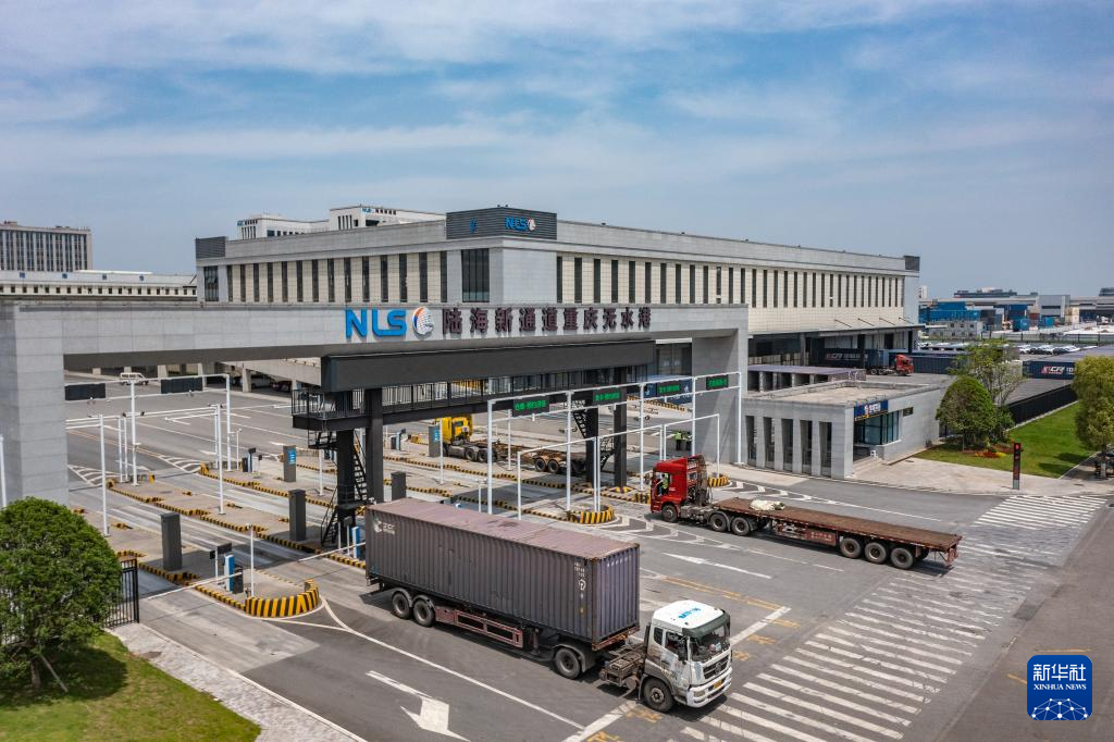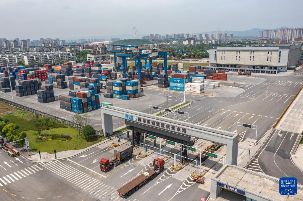 5月5日,在重庆国际物流枢纽园区,转运卡车在陆海新通道重庆无水港来往穿梭(无人机照片)。