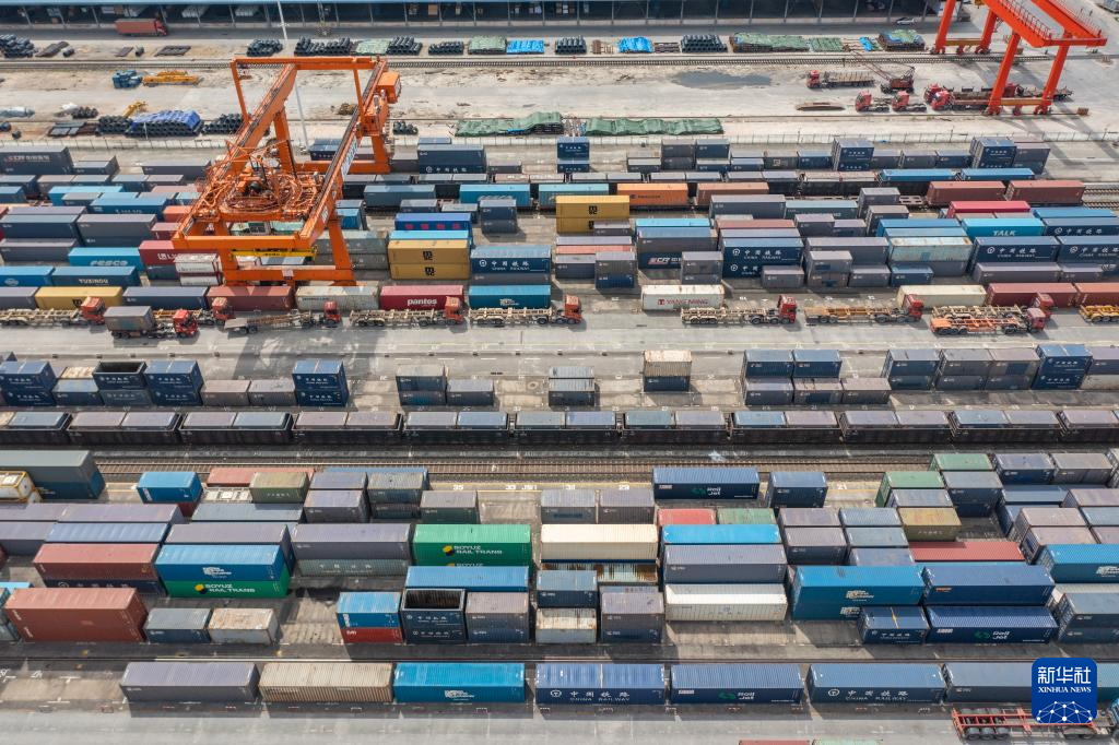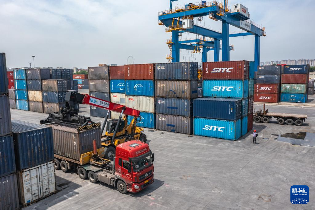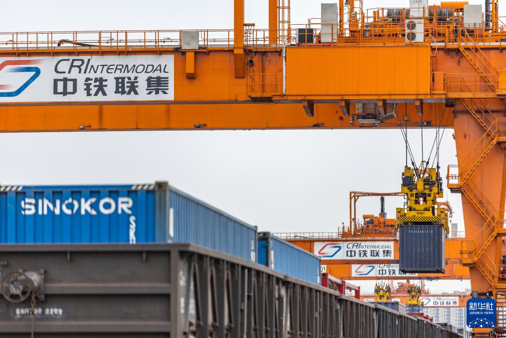 随着货物运输量日益增长,位于重庆市沙坪坝区的重庆国际物流枢纽园区龙门吊起降不停、转运卡车来往穿梭……一片繁忙景象。