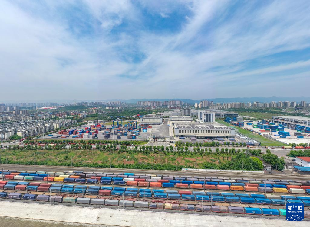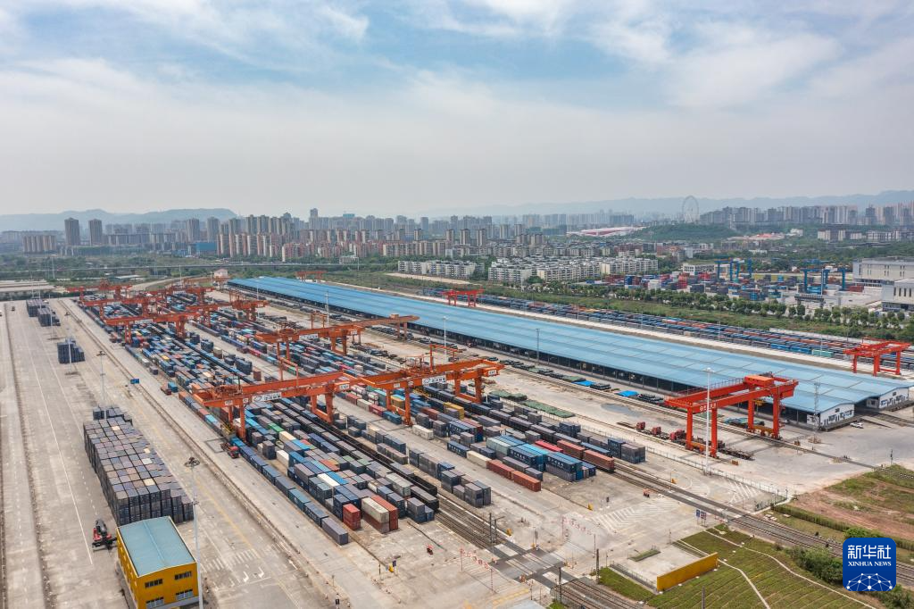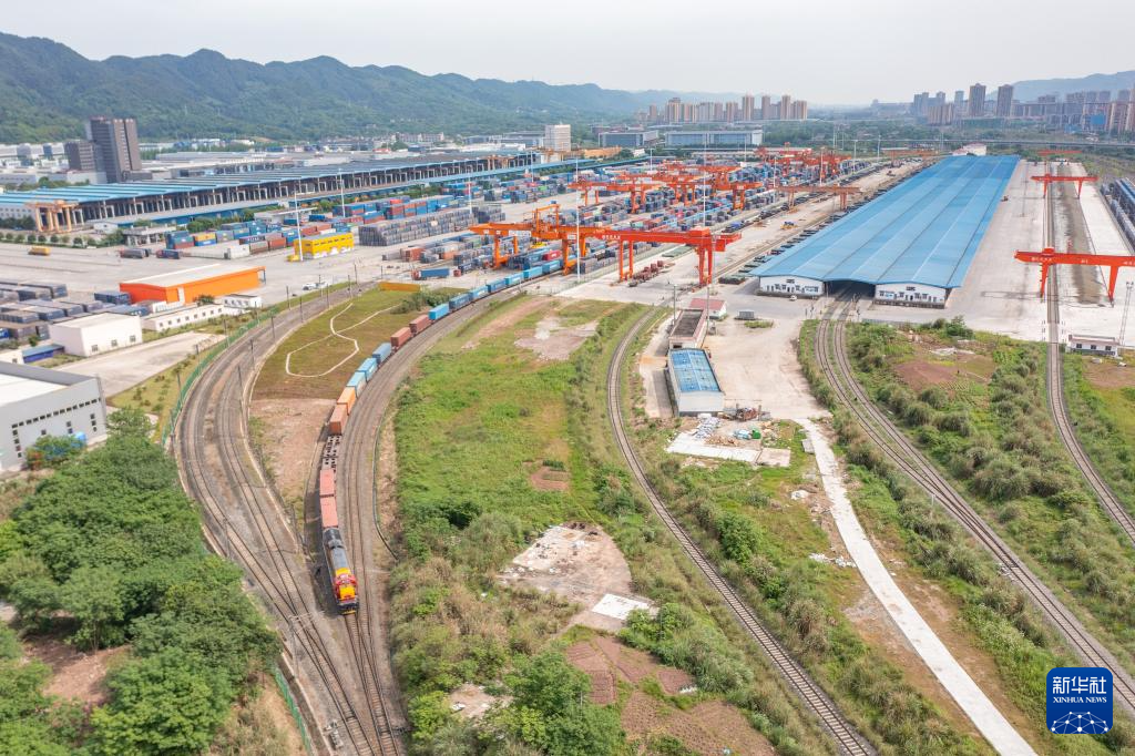 5月5日,在重庆国际物流枢纽园区,一列装载机械设备、汽车和笔记本电脑的中欧班列从重庆团结村中心站驶出(无人机照片)。