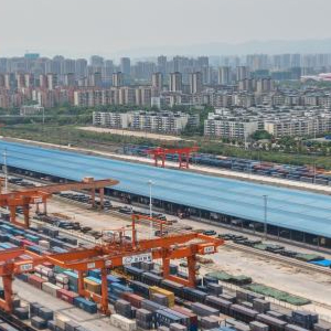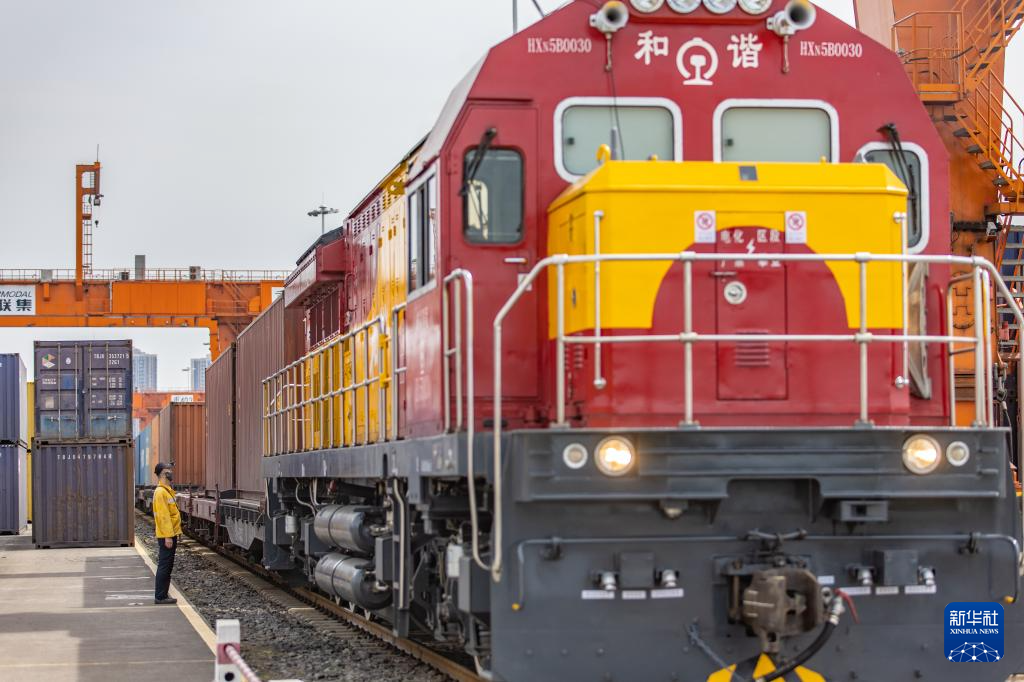 5月5日,在重庆国际物流枢纽园区,一列装载机械设备、汽车和笔记本电脑的中欧班列在重庆团结村中心站等待发车。