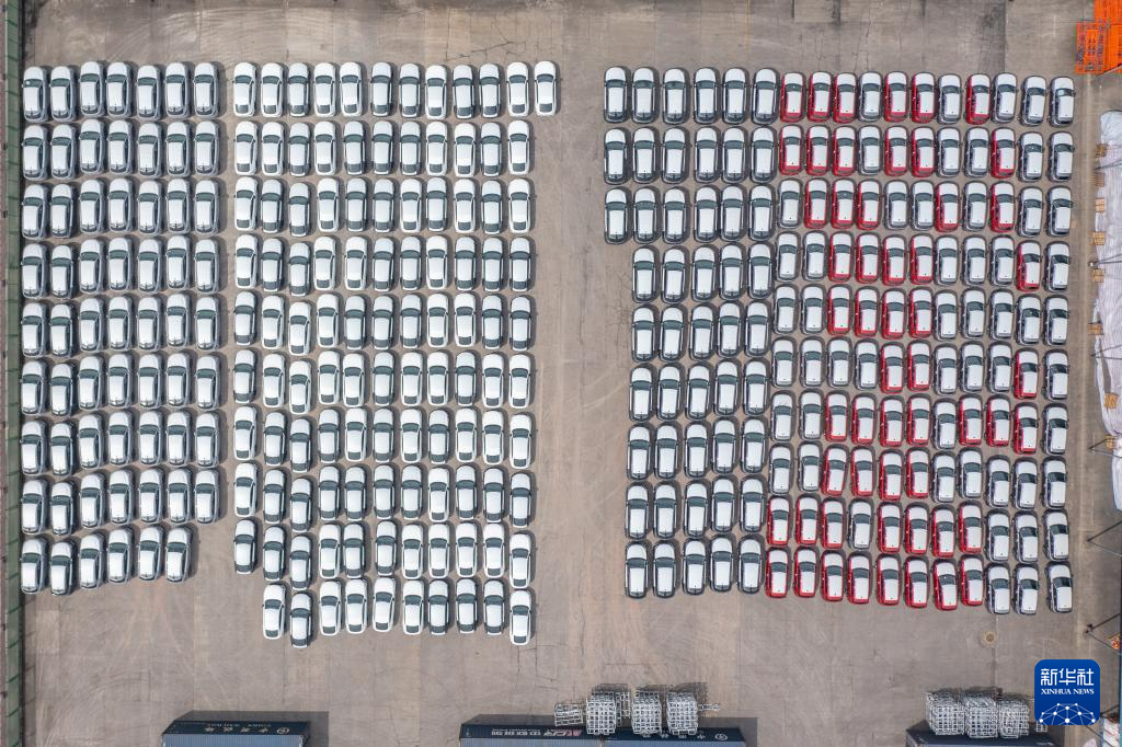 5月5日,在位于重庆国际物流枢纽园区的团结村中心站,重庆制造的汽车等待装车出口(无人机照片)。