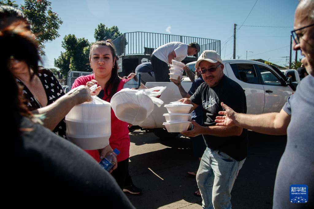 5月6日,在巴西南里奥格兰德州新汉堡,志愿者为受灾民众分发食物。