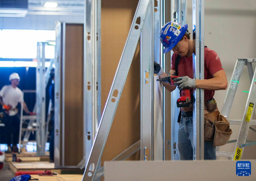 5月6日,在加拿大多伦多举行的安大略省学生技能大赛中,一名学生参加石膏板隔墙搭建与墙面抹灰比赛。