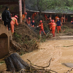 5月7日,在广西岑溪市波塘镇六肥村,救援人员在清理被洪水摧毁的树木。