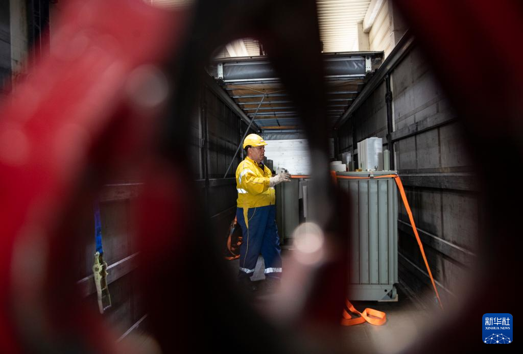 4月29日,工人在位于匈牙利布达佩斯的切佩尔港物流园仓储区域将货物装车。