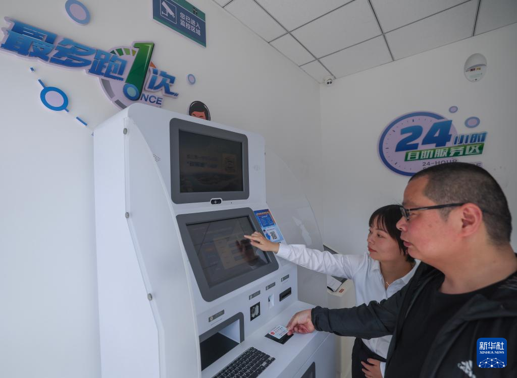 5月9日,在嘉兴市秀洲区王江泾镇便民服务中心的自助终端一体机前,工作人员指导居民对在苏州工作期间的社保缴费记录进行自助跨省查询。