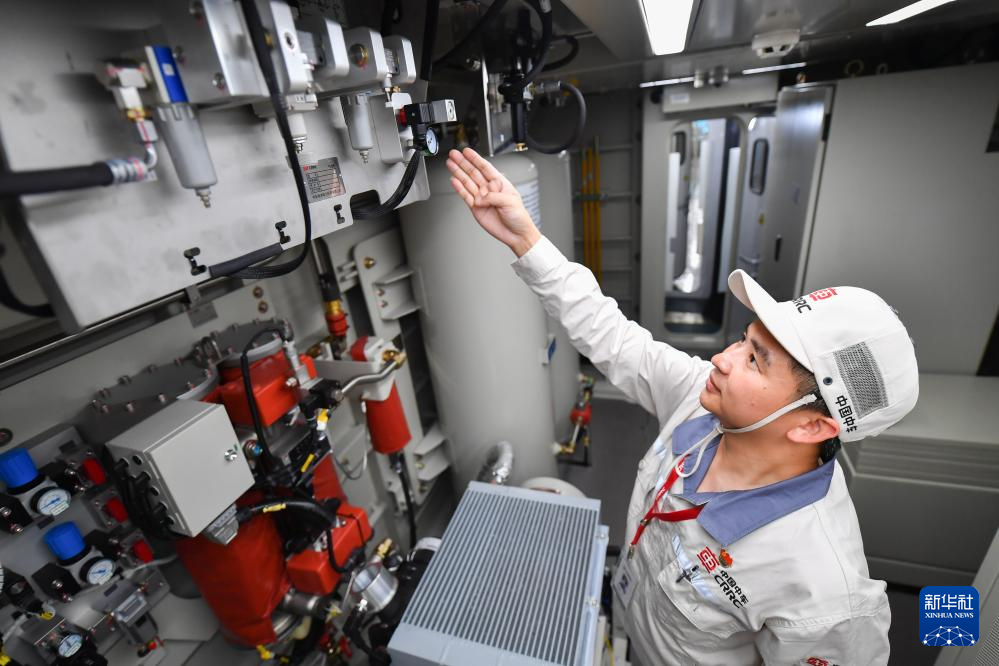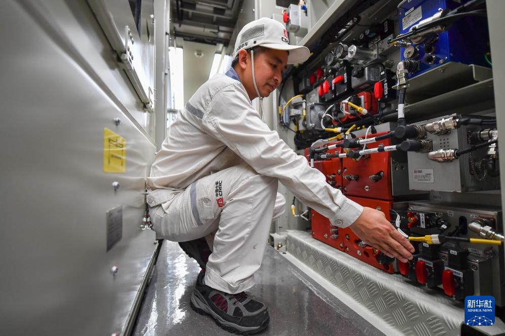 5月9日,工作人员在机车的智能座舱内查看视频监控、360环影的运行情况。