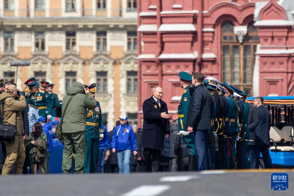 5月9日,在俄罗斯首都莫斯科,俄罗斯总统普京(中)与参与阅兵式的人员握手。