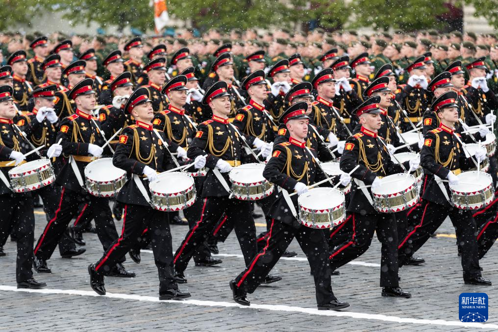 5月9日,在俄罗斯首都莫斯科,鼓手编队走过红场。