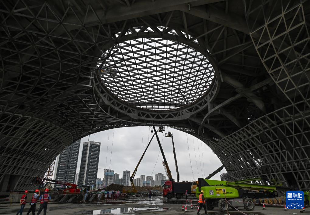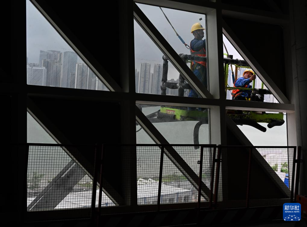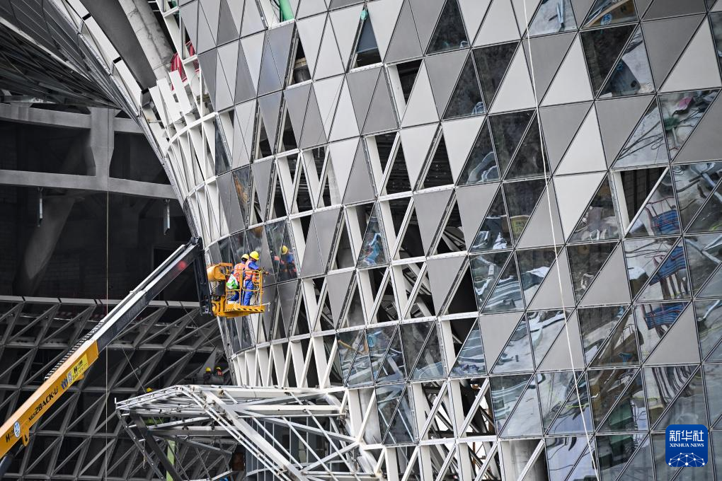 5月10日,中建深装建设者在湛江文化中心进行幕墙施工。