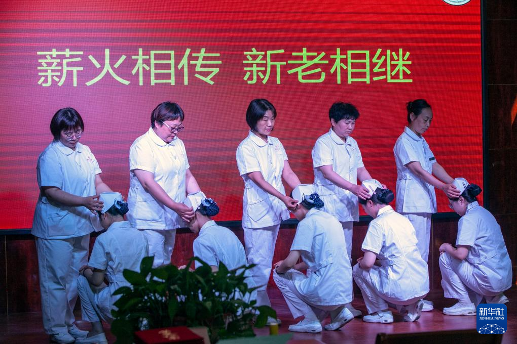 5月10日,在河南省焦作市博爱县中医院举行的薪火相传仪式上,资深护理人员为新护士授帽。