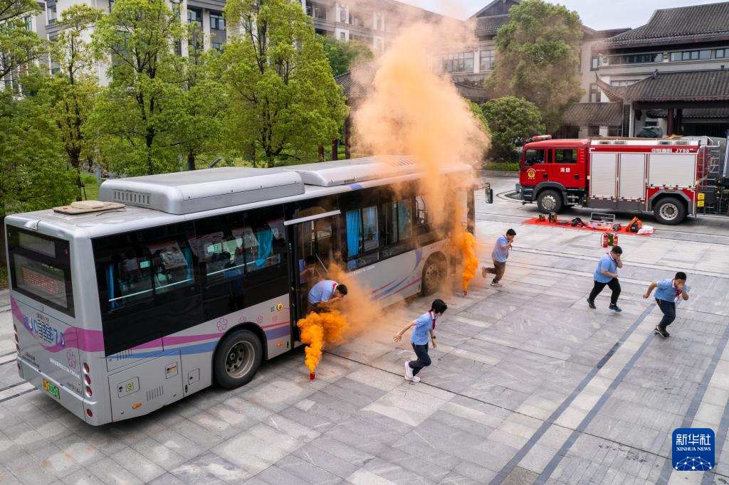 5月10日,在湖南省常德市消防救援支队在常德经开区德善学校开展的“校车消防安全教育活动”上,消防员为学生讲解遇险时使用天窗逃生方法。
