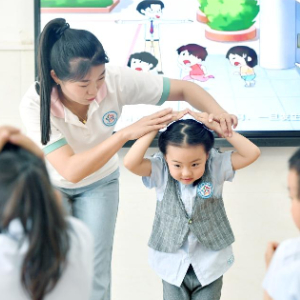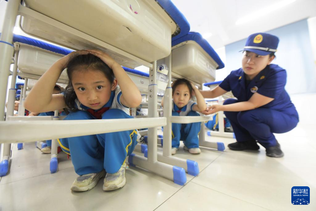 5月10日,在河北省石家庄市长安区盛世之星幼儿园,孩子们在老师带领下学习地震自救知识。