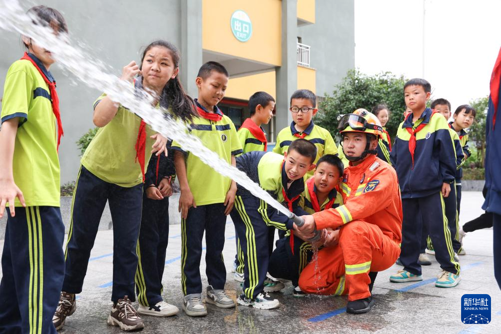 5月10日,贵州省黔东南苗族侗族自治州岑巩县第四小学的孩子们在消防员的指导下体验消防水枪。