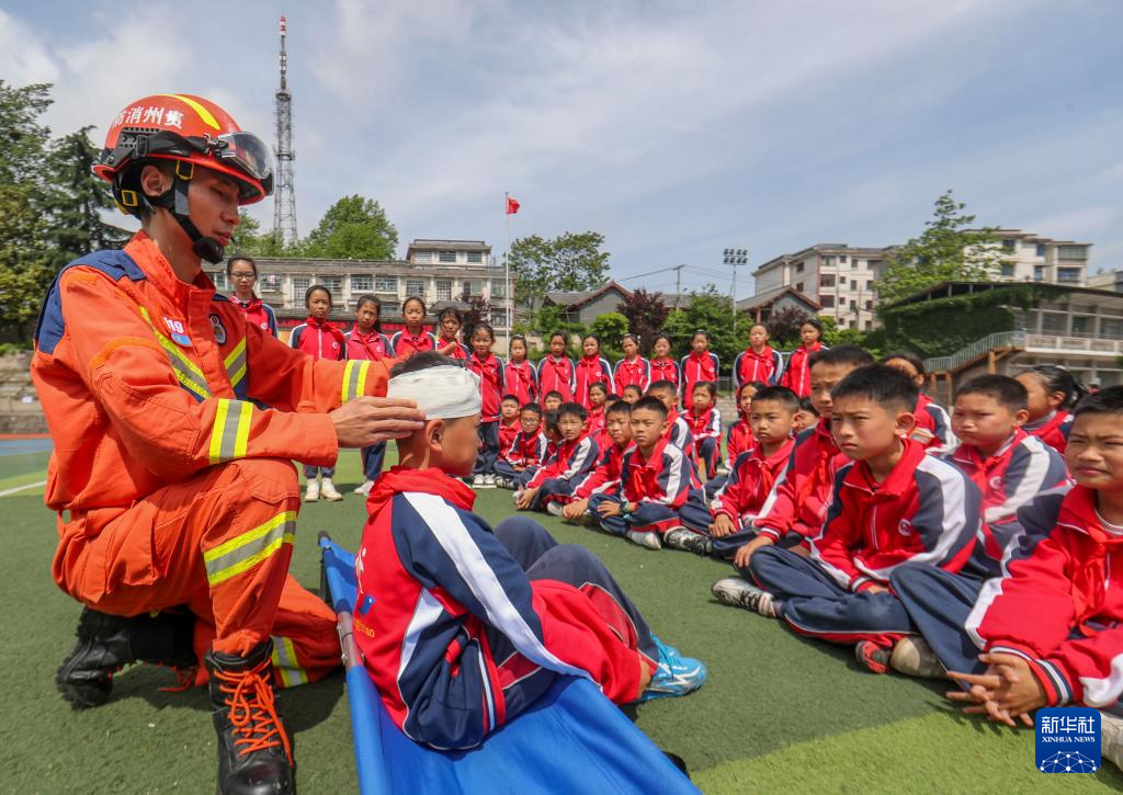 5月10日,消防员在贵州省开阳县第一小学为学生进行伤员包扎操作演示。