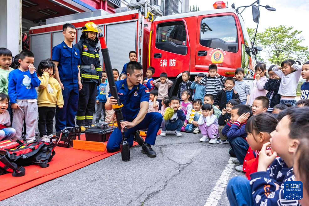 5月10日,消防救援人员在贵州省安顺经济技术开发区消防救援大队给小朋友展示消防器材。