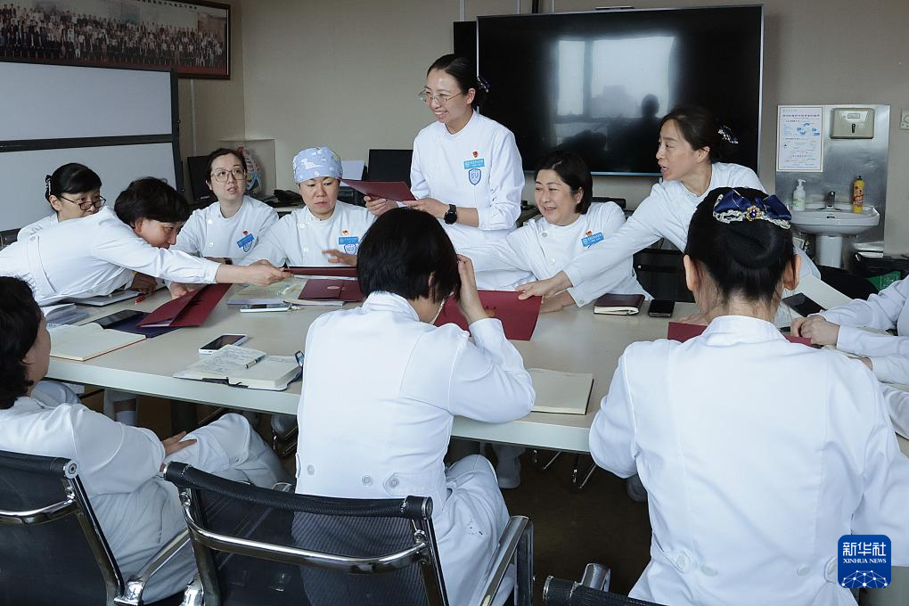 5月10日,樊榕榕(左三)在护士早交班上交待事宜。
