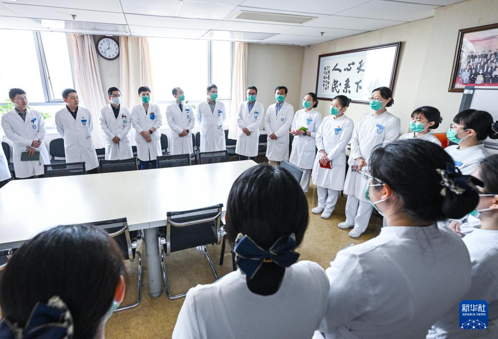 5月10日,樊榕榕(左九)与医生、护士一起参加早交班。