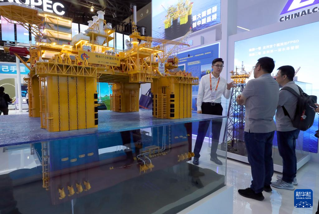 5月11日,参观者在中国海油展台上的10万吨级深水半潜式生产储油平台深海一号能源站模型展品旁交流讨论。