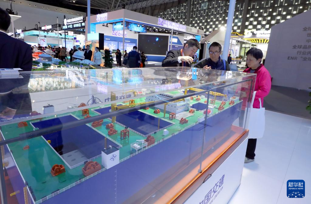 5月11日,工作人员(右三)在中国交建展出的自航式沉管运输安装一体船模型旁向参观者做介绍。