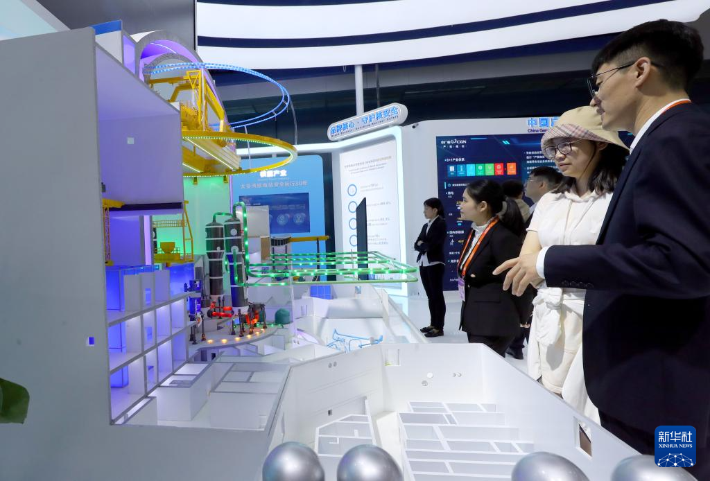5月11日,参观者在中国广核集团展台上的华龙一号核电技术展示模型前驻足观看。