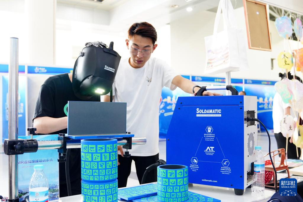 5月11日,在济南舜耕国际会展中心济南职业学院展台,一位同学在体验MR虚拟焊接培训系统。
