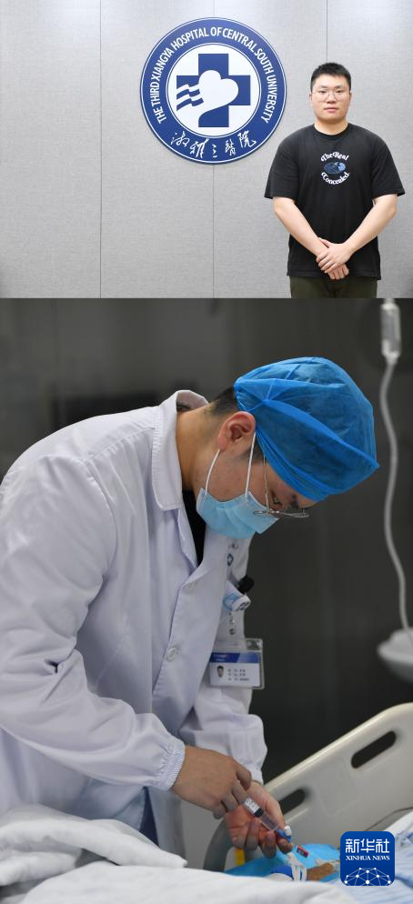这是一张拼版照片:上图为欧阳云峰肖像(2024年5月9日摄);下图为2024年5月9日,中南大学湘雅三医院重症医学科护士欧阳云峰(右)在同事郑昊义协助下穿护理服。