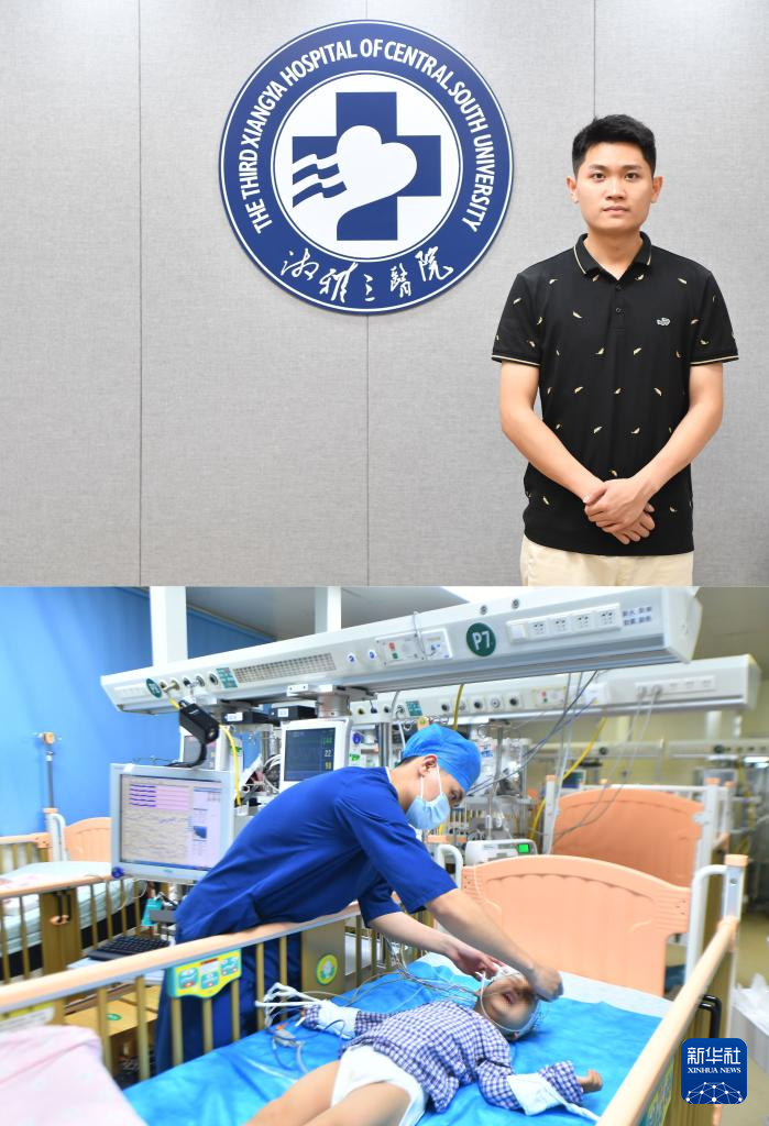这是一张拼版照片:上图为刘颖哲肖像(2024年5月9日摄);下图为2024年5月9日,刘颖哲在儿科监护室护理患儿。