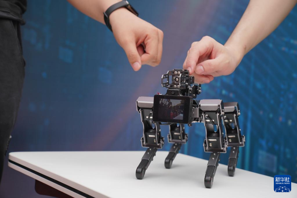 5月13日,在哈尔滨工业大学学生创新创业成果展现场,参展团队成员展示一款机器人。