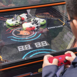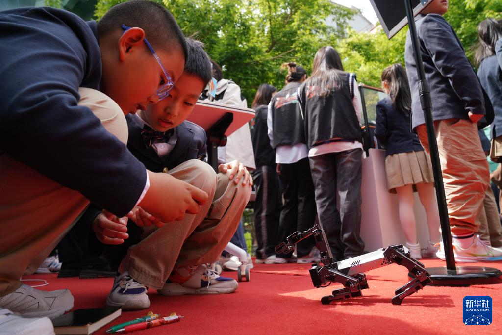5月13日,在哈尔滨工业大学学生创新创业成果展现场,小学生在参与体验桌面竞技机器人项目。