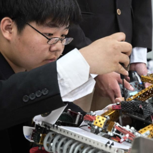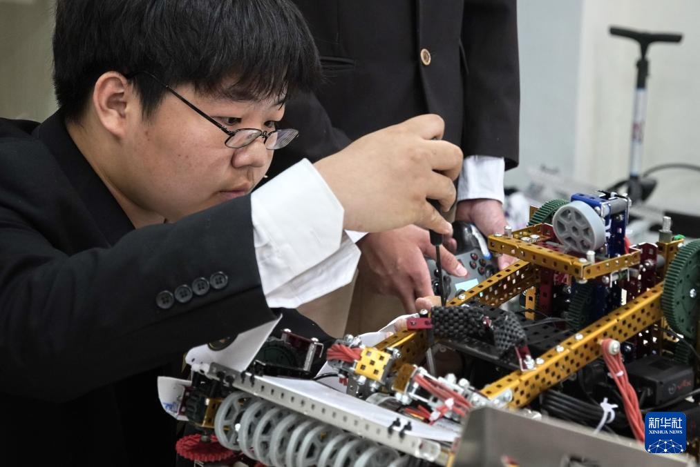 5月13日,北京市第八十中学机器人社团学生黎沛霖在调试一款机器人。