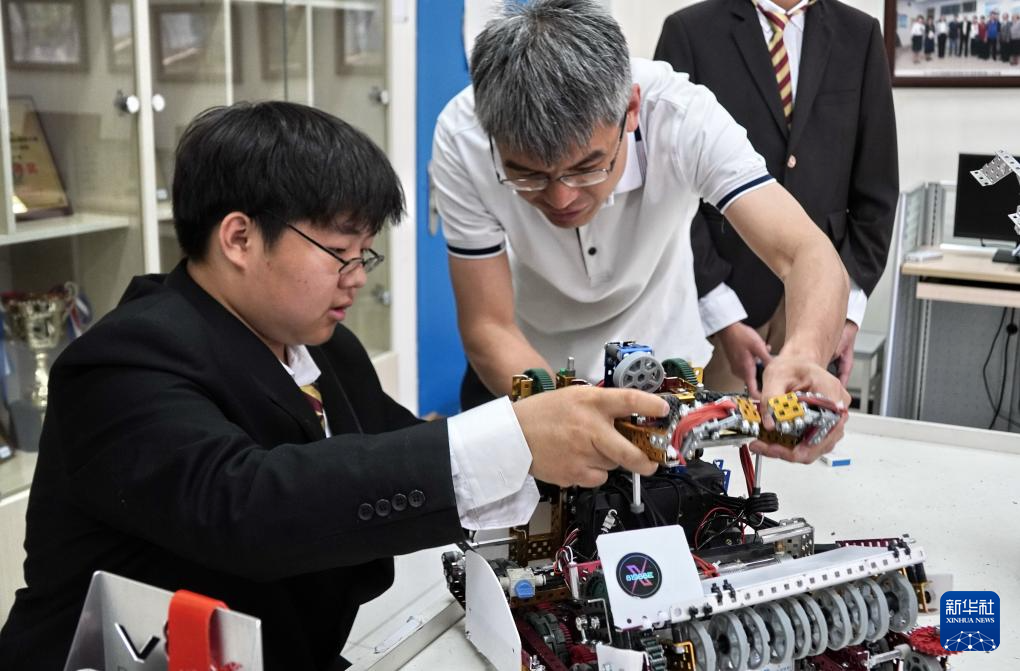 5月13日,北京市第八十中学机器人社团负责人张朋老师(右)和学生黎沛霖调试改进一款机器人。