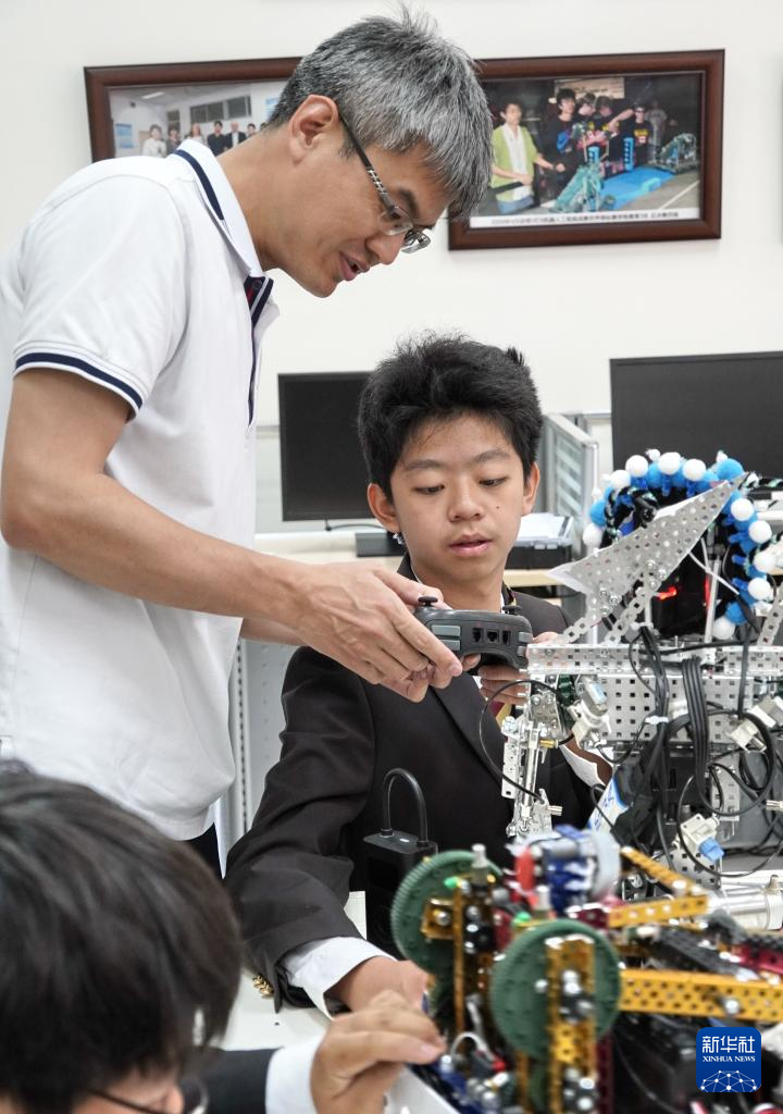 5月13日,北京市第八十中学机器人社团负责人张朋老师(左)在指导学生俞欣雷调试一款机器人。