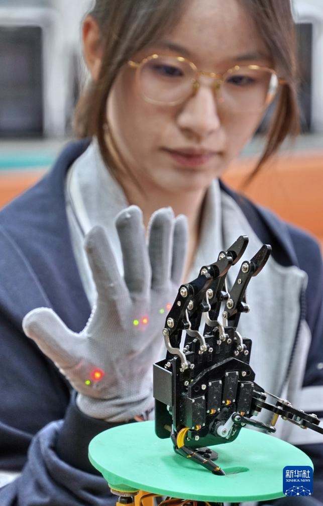 5月13日,北京市第八十中学高二学生莽舒晗在展示她设计制作的仿生学设备。