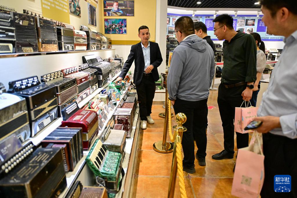 在伊犁哈萨克自治州伊宁市六星街,游客在亚历山大手风琴珍藏馆参观(5月11日摄)。