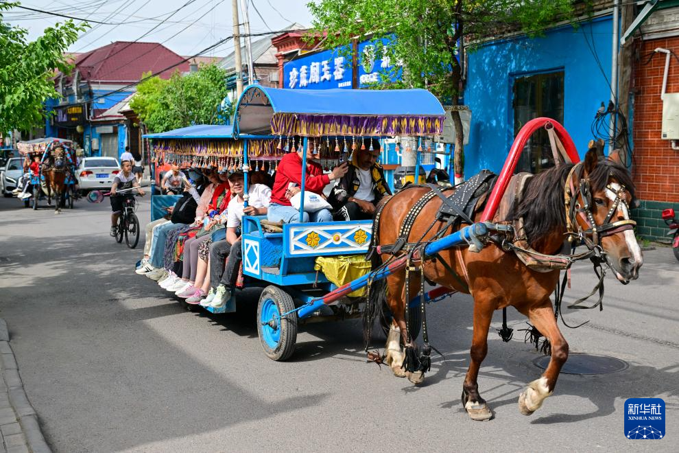 在伊犁哈萨克自治州伊宁市喀赞其民俗旅游区,游客乘坐马车观光游览(5月10日摄)。