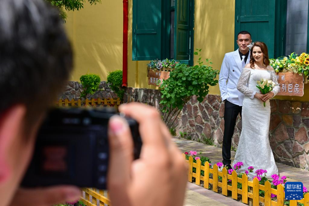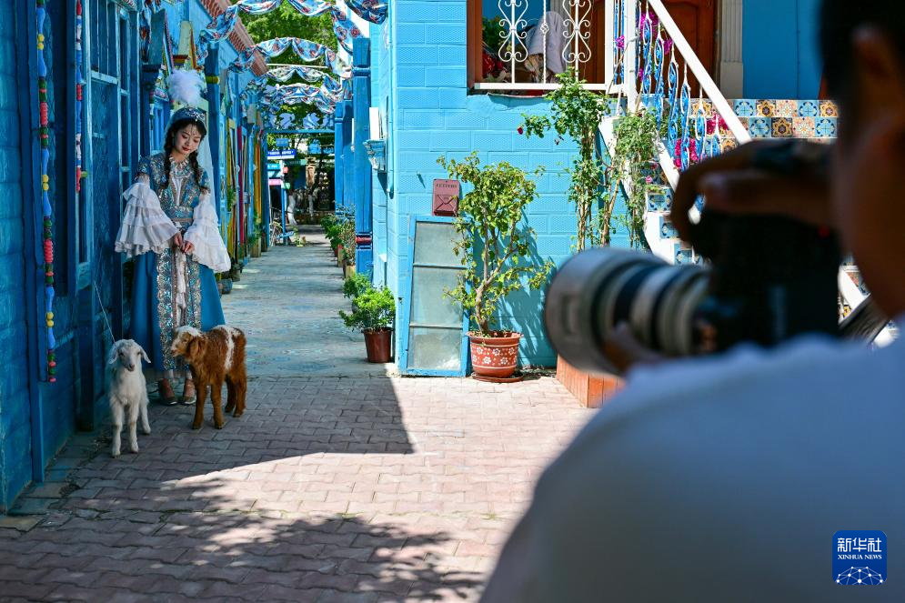 在伊犁哈萨克自治州伊宁市六星街,游客体验旅拍项目(5月10日摄)。